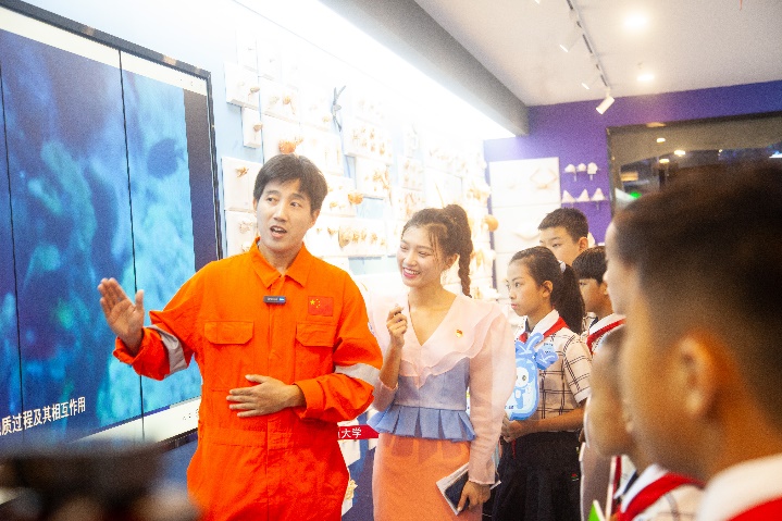 学校科研院刘培军副院长出席了活动开幕式,学院谭运阳书记在开幕仪式上致辞。学院周剑老师和广西广播电视台都市频道主持人黄莹担任活动主持,学院本科21级黄金生同学、21级硕士研究生罗伟霖同学、21级硕士研究生李劲同学、22级硕士研究生韦炎钦同学、20级博士研究生王永刚、韩民伟同学分别向少先队员们科普了海洋科学知识,分享了学院“蓝色梦想”科考队的科考故事。