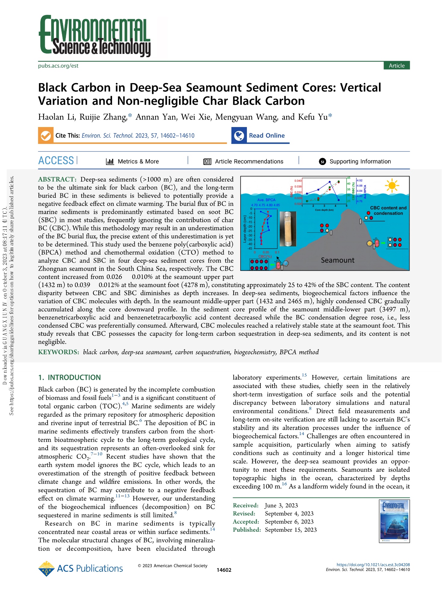 Li Haolan, Zhang Ruijie, Yan Annan, Xie Wei, Wang Mengyuan,Yu Kefu. Black Carbon in Deep-Sea Seamount Sediment Cores: Vertical Variation and Non-negligible Char Black Carbon, Environmental Science & Technology, Online Sep. 15, 2023, https://doi.org/10.1021/acs.est.3c04208