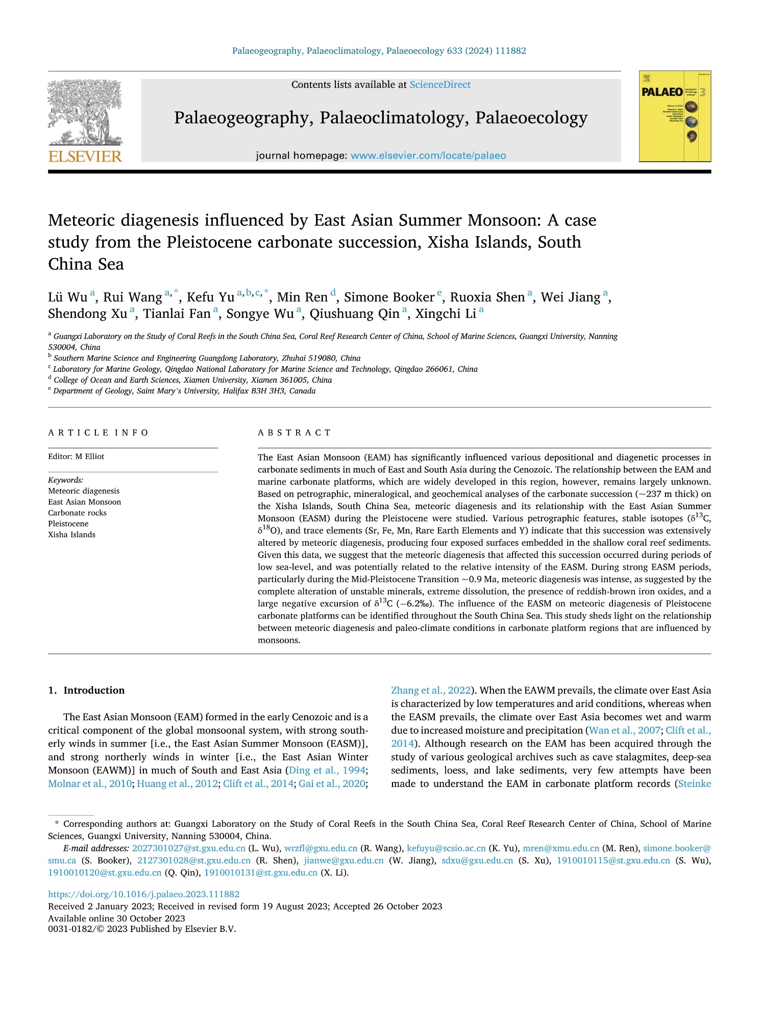 近日,在我院王瑞副教授等的指导下,硕士研究生吴律以第1作者身份在经典SCI期刊Palaeogeography Palaeoclimatology Palaeoecology(二区Top)上发表论文“Meteoric diagenesis inffuenced by East Asian Summer Monsoon: A case study from the Pleistocene carbonate succession, Xisha Islands, South China Sea”。该论文揭示了更新世时期西沙地区珊瑚礁灰岩的大气淡水成岩作用受到了东亚季风的影响,为了解碳酸盐岩台地发育演化与古气候之间的关系提供了新的视角。
