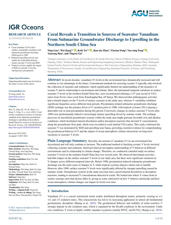 Guo, N., Jiang, W., Yu, K., et al. (2023). Coral reveals a transition in sources of seawater vanadium from submarine groundwater discharge to upwelling in the northern South China Sea. Journal of Geophysical Research: Oceans, 128, e2023JC020104. https://doi.org/10.1029/2023JC020104